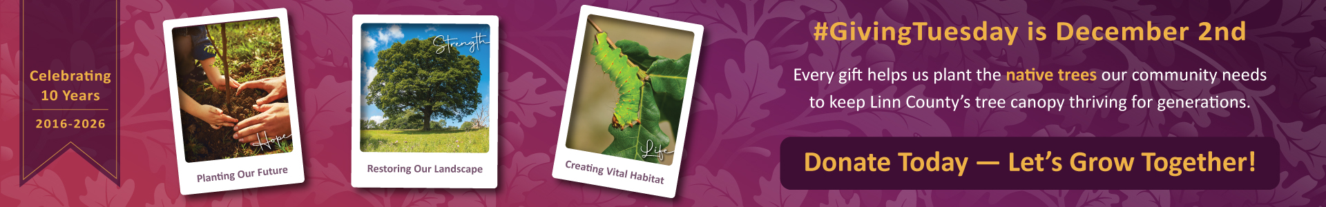 The Planting Forward initiative began after the August 10, 2020, derecho devastated Cedar Rapids, IA, destroying over 50% of the tree canopy and damaging 8,000+ homes. Its goals are to replant Linn County with native trees and educate residents on tree care and the benefits of native species to the environment, pollinators, and people.