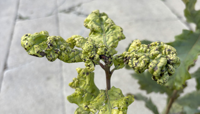 Galls are small bumps or swellings that can appear on oak leaves or twigs. Galls are caused by tiny insects and are harmless to the tree’s overall health.